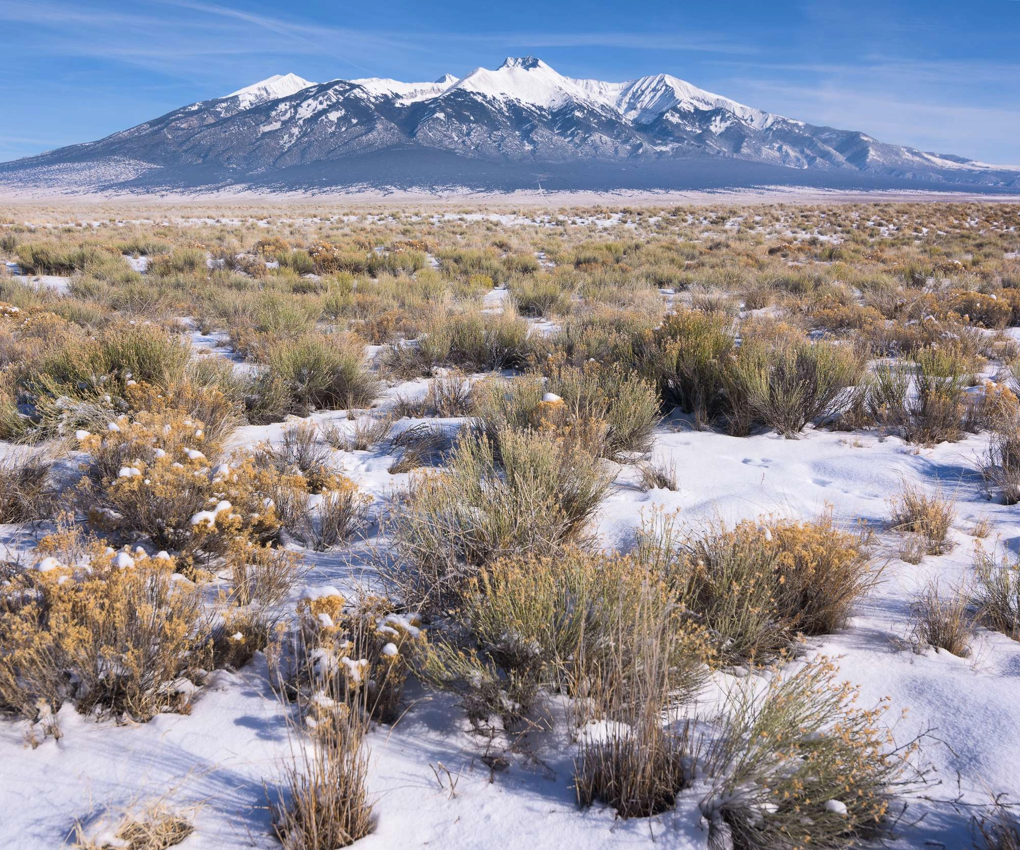 Snow lies on a Colorado desert range in the south of the state. This image shows the sweeping landscape and vastness of the Colorado desert.