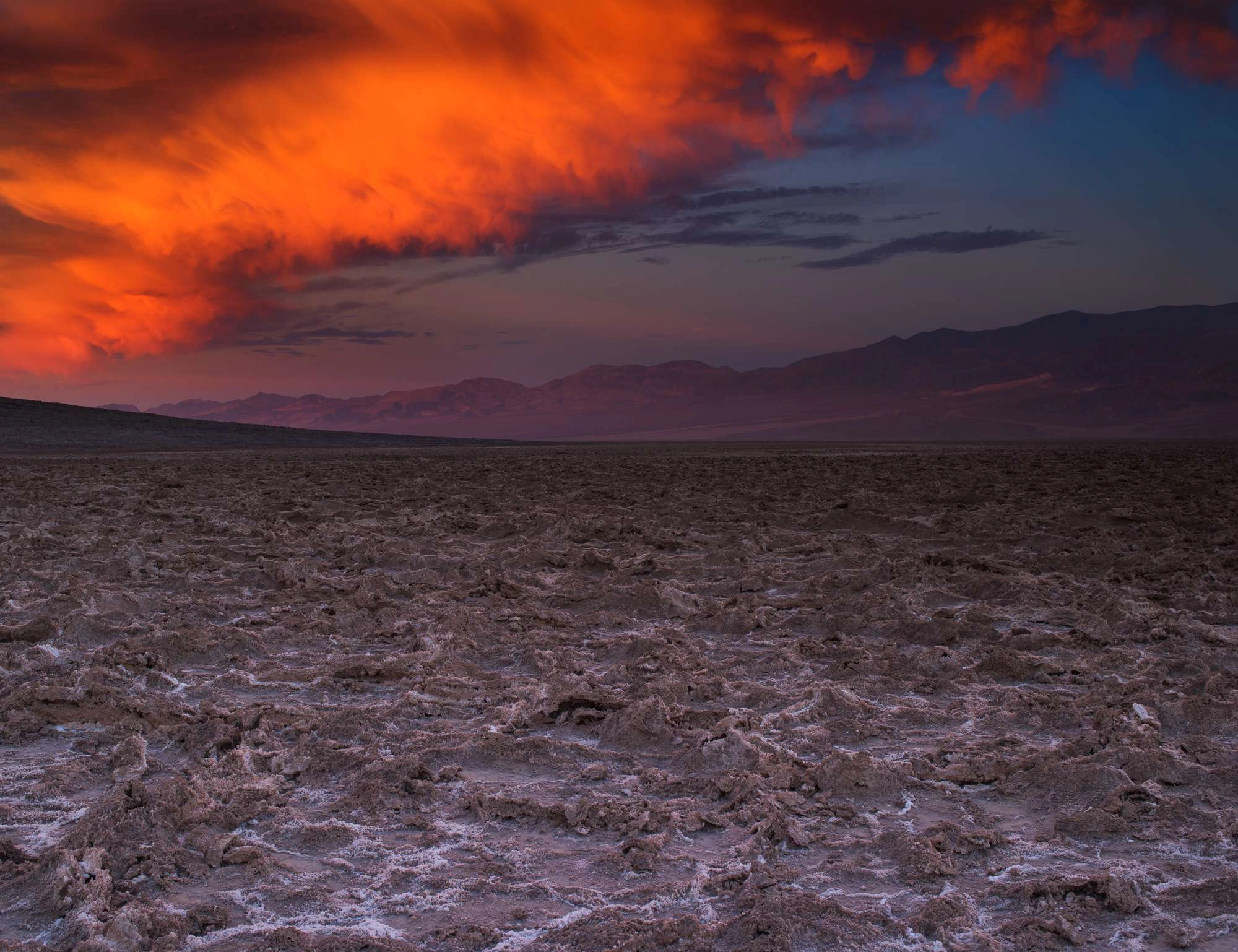 At 86 meters below sea level, the Badwater Basin Salt Flats are located at the lowest elevation in North America. The climate here is extremely dry and typically receives very little rain. However, it can receive heavy storms that form temporary lakes. This water will quickly evaporate and leave a crust of salt crystals on the ground. The salt crystals constantly expand and change shape, mix with the soil below, and form the jagged, haphazard shapes that can be seen in Fire in the Sky.