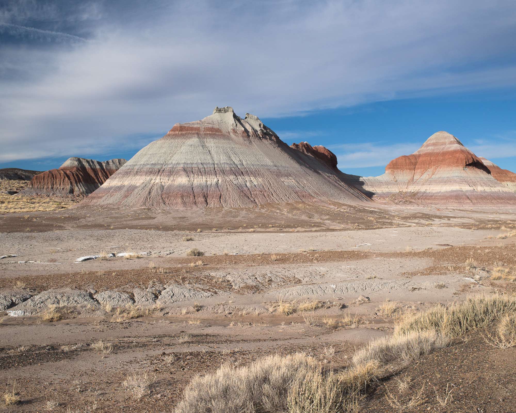 Mole Hills was taken just off a roadway in the Painted Forest area of the Petrified Forest National Park. This photograph captures what you would see when standing on the flat desert floor, looking directly at one of the Teepees. Looking upwards you can see the whispery clouds in the deep blue sky that overlook the multicoloured hills and the flat sandy ground below. You can almost feel the heat of the sun and smell and feel the dust in the air.