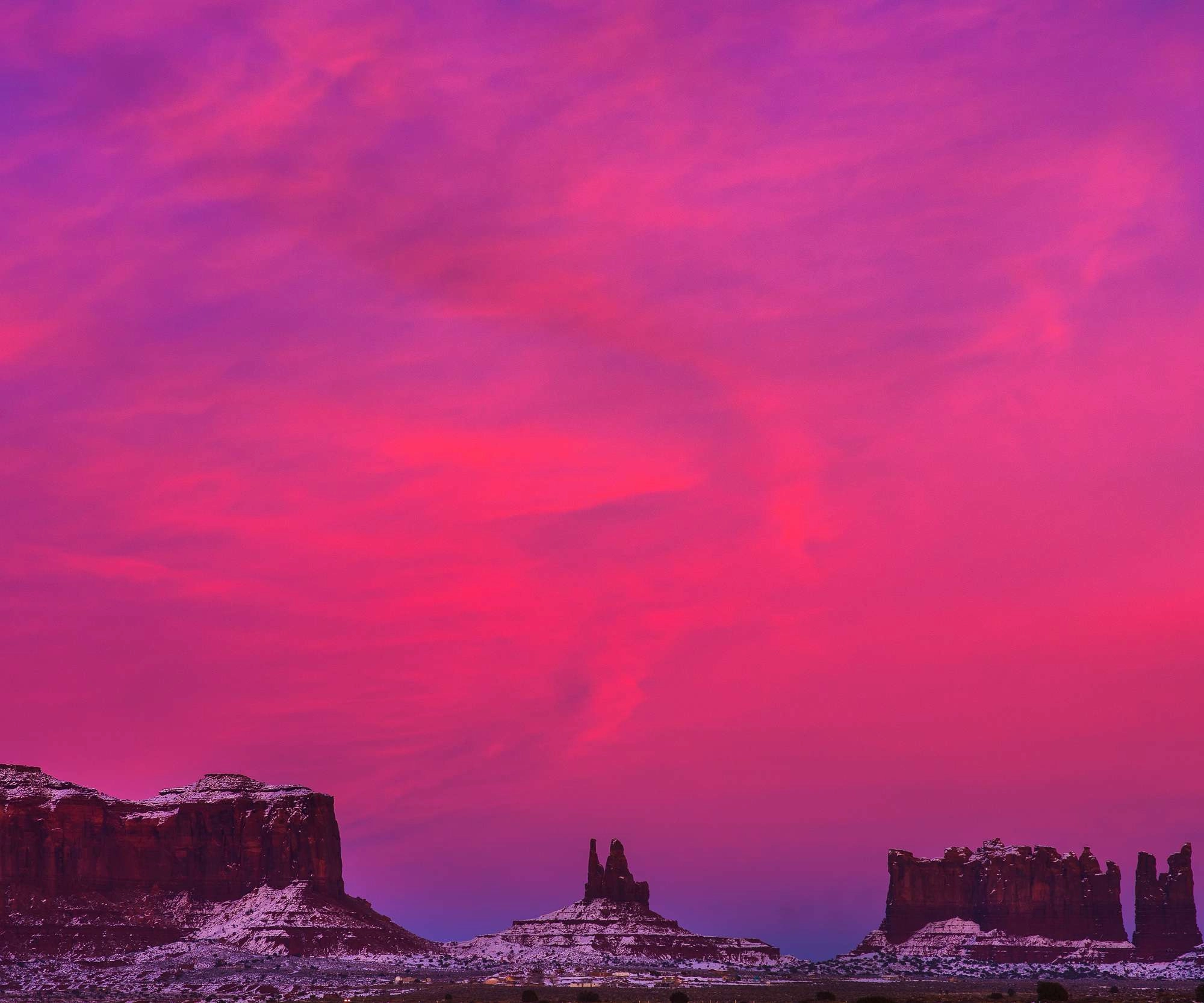 Monument Valley, Utah. The sky opens up over the famous valley in a midwinter sunset. The valley is famous from the countless western movies that have been filmed there. The sky almost seems to outshine the spectacle.