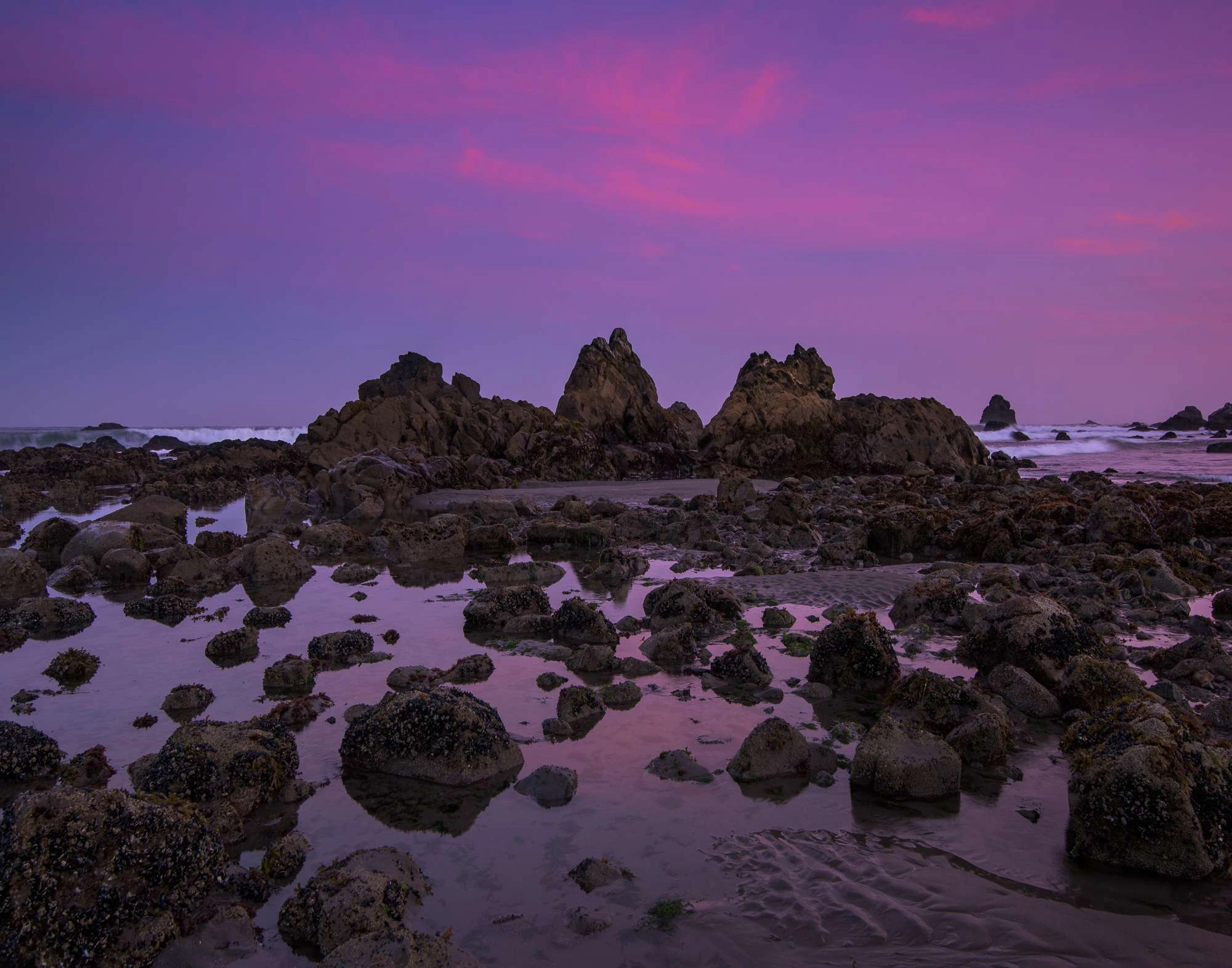 The Pacific Ocean captures a sunset that can be found on the Pacific Coast at Redwood National Park. The dawn sky casts a richly coloured hue over the pacific ocean and its rock strewn beach. Looking into this picture you can imagine standing on the beach feeling the chill in the air as you hear the crashing waves, and look up at the brilliantly coloured sky.