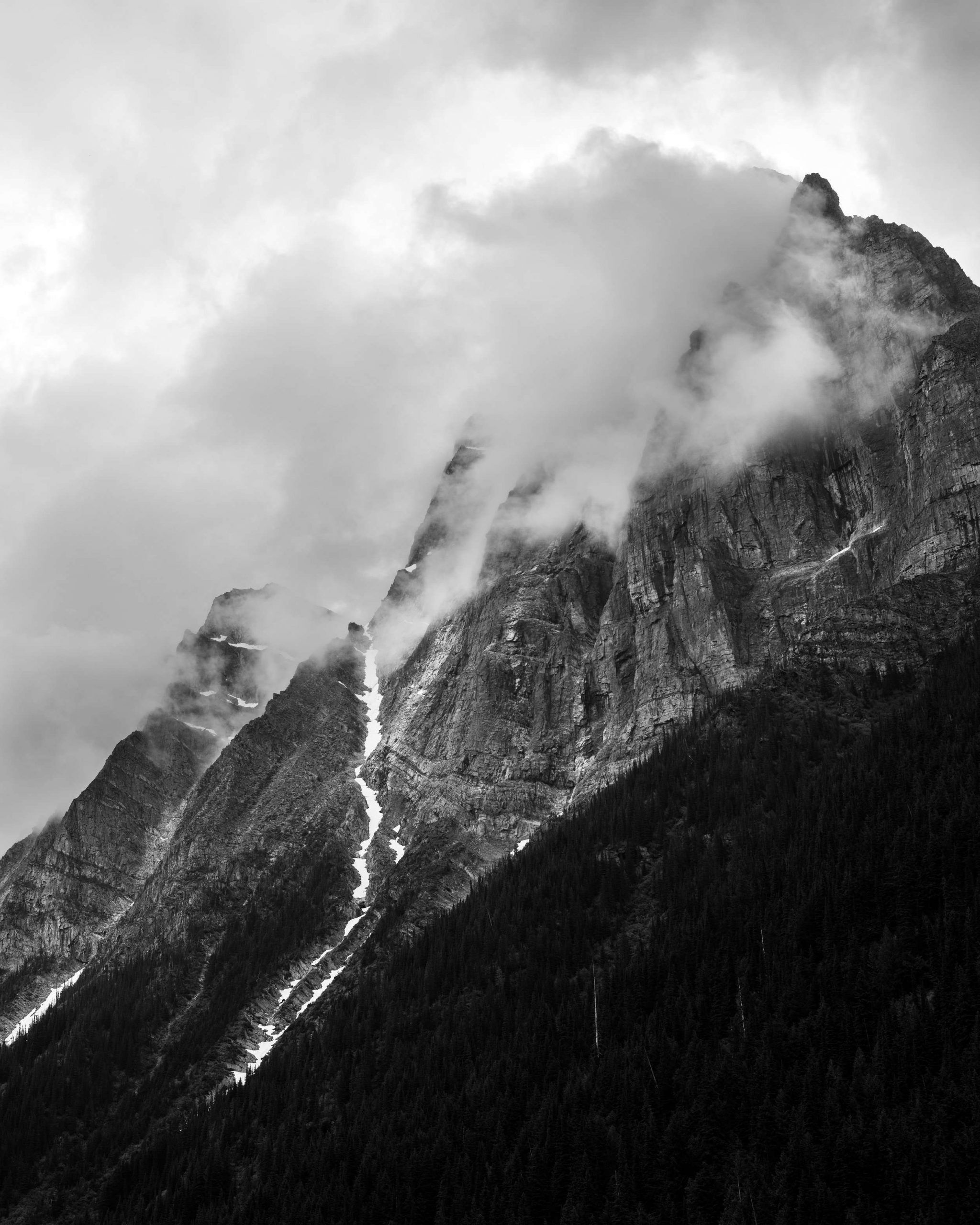 Mountain peaks pointing towards the sky. with clouds traveling across the mountain range. Photographed in the Canadian Rockies.
